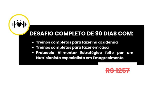 Desafio completo com treino + nutrição que MUDA a cada 30 dias, porque monotonia engorda e o verdadeiro resultado vem com estímulo. Aqui, ele muda todo mês.